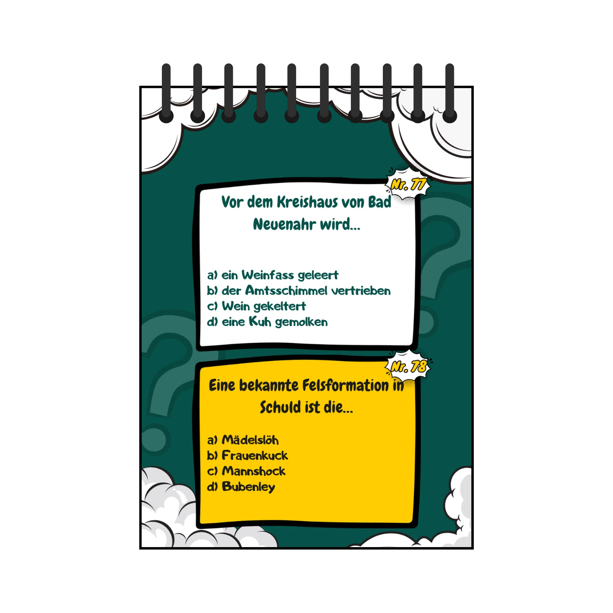 Dieses Quiz lädt dazu ein, das Ahrtal auf unterhaltsame Weise kennenzulernen. In 92 abwechslungsreichen Fragen geht es um regionale Spezialitäten, geschichtliche Ereignisse, kulturelle Besonderheiten und die eindrucksvolle Landschaft der Region. Ideal für gemeinsame Spieleabende, als Geschenk oder für alle, die ihr Wissen über das Ahrtal testen möchten.
