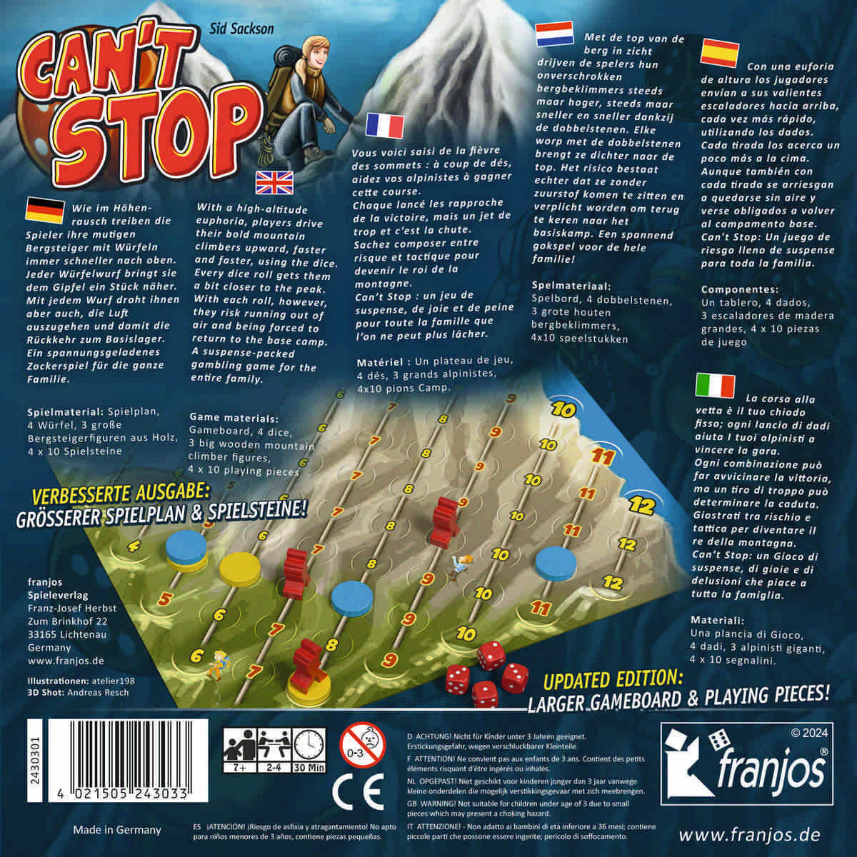 In CAN'T STOP EDITION 2025 schickst Du mutige Bergsteiger auf den Weg zum Gipfel, angetrieben vom puren Würfelglück. Jeder Wurf bringt Dich höher, lässt die Hände schwitzen – und lässt Dich hoffen, dass Du nicht zu gierig wirst. Denn wer zu viel riskiert, verliert alles und muss zurück ins Basiscamp.