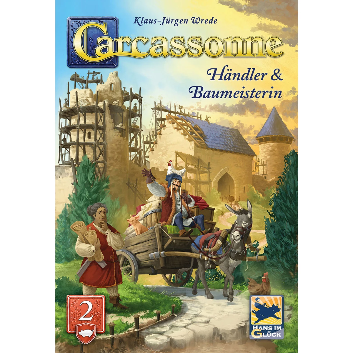 In der 2. Erweiterung Händler & Baumeisterin für das preisgekrönte Familienspiel Carcassonne (Spiel des Jahres 2001) besuchen Händler die Stadt. Durch Stadtabschlüsse erhaltet ihr wertvolle Waren, um am Spielende Extrapunkte zu erhalten. Schickt eure Schweine auf die Wiesen, um diese früh zu werten und so die Erträge eurer Bäuerinnen zu steigern. Beschleunigt den Bau eurer Straßen und Städte mit der Baumeisterin – und löst mit dem richtigen Timing epische Doppelzüge aus!