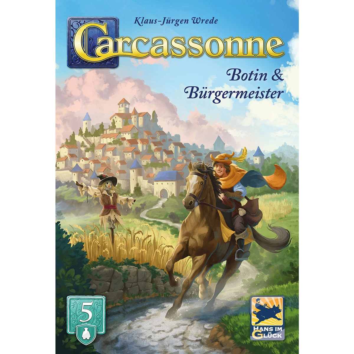 In der 5. Erweiterung Botin & Bürgermeister für das preisgekrönte Familienspiel Carcassonne (Spiel des Jahres 2001) werben Bürgermeister um die Gunst eurer Ritter und werden ins Rathaus beordert. Setzt euren Bürgermeister in fremde Städte und konvertiert gegnerische Meeple. Mit eurer Botin und dem Strohmann könnt ihr zusätzlichen Einfluss ausüben. Ist die Straße der Botin fertig, reitet sie zur nächsten Straße oder in die Stadt. Platziert euren Strohmann auf fremden Wiesen, um Bäuerinnen einzuschleusen.