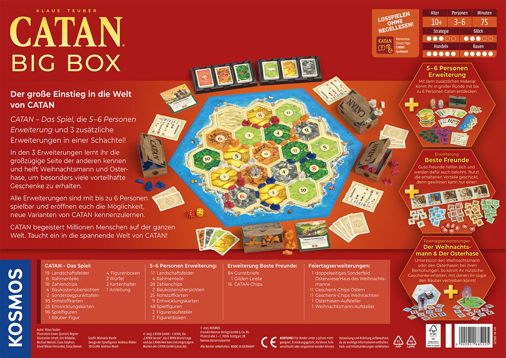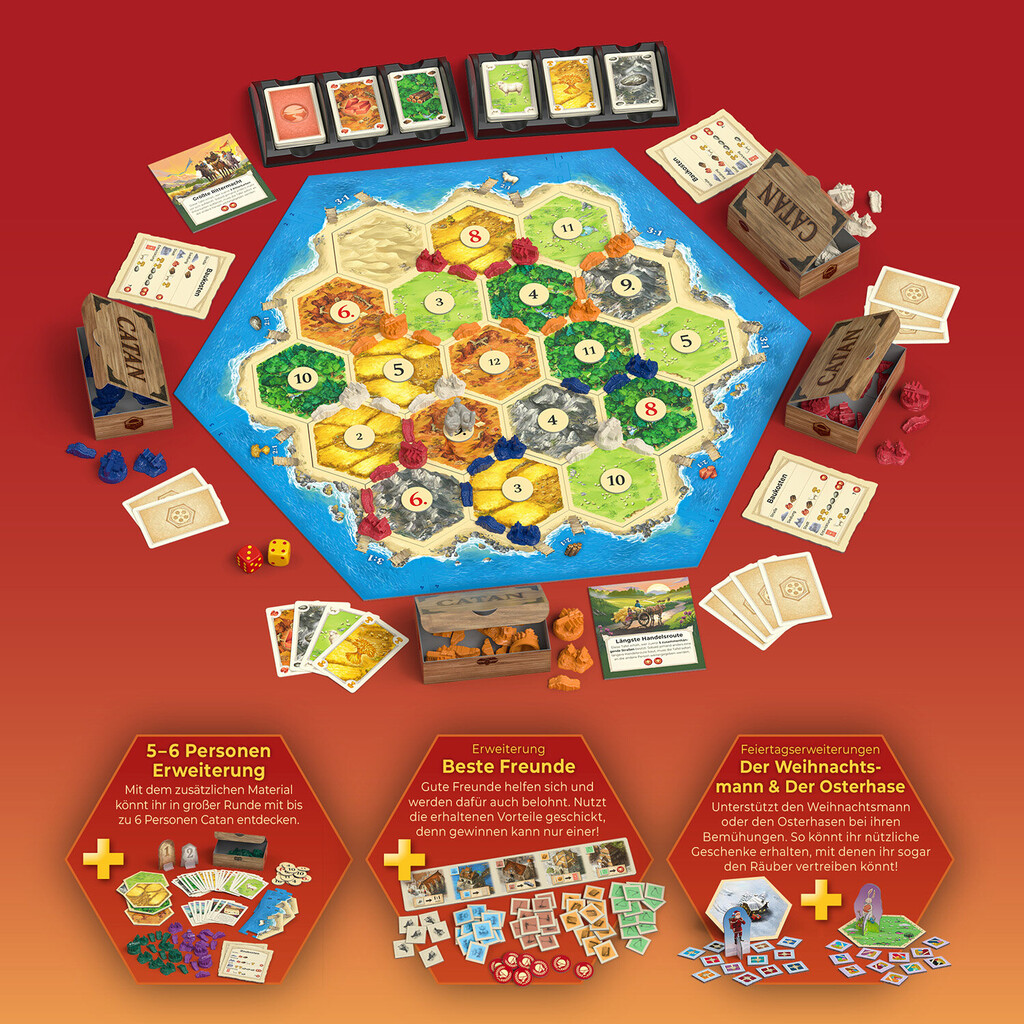 In dieser Box stecken ganz viel Abwechslung und Abenteuer mit CATAN – Das Spiel, der 5–6 Personen Erweiterung zu CATAN – Das Spiel und den drei Bonus-Erweiterungen Beste Freunde, Der Osterhase und Der Weihnachtsmann. Mit drei bis sechs Personen könnt ihr gemeinsam in die Welt von CATAN eintauchen und euch als mutige Entdecker auf der Insel niederlassen. Durch geschickten Rohstoffhandel steigert ihr kontinuierlich euren Wohlstand und könnt so immer mehr Straßen, Siedlungen und Städte errichten. Die drei Bonus-Erweiterungen Beste Freunde, Der Weihnachtsmann und Der Osterhase lassen Spielerinnen und Spieler noch tiefer in die fantasievolle Welt von Bestseller-Spieleautor Klaus Teuber eintauchen und bringen Abwechslung ins Spiel. Der perfekte Einstieg für Spielerinnen und Spieler ab zehn Jahren – super geeignet als Geschenk für alle Neueinsteiger.