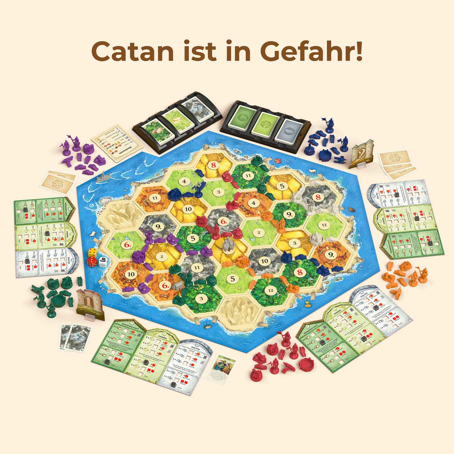 Mit dem Wohlstand kommen neue Herausforderungen: Wilde Barbaren greifen Catan an! Mutige Ritter entwickeln Strategien, um die Angreifer in die Flucht zu schlagen. Zwei zusätzliche Figurenaufsteller, weiteres Spielmaterial und neue Regeln ermöglichen es fünf bis sechs Spielerinnen und Spielern mit ihren Rittern gegen die Barbaren anzutreten. Zum Spielen der Erweiterung sind CATAN – Das Spiel, die Ergänzung von CATAN – Das Spiel für fünf bis sechs Spielerinnen und Spieler ab zwölf Jahren und die Erweiterung „Städte und Ritter“ notwendig. Siedeln, handeln, bauen: der Klassiker mit noch mehr Spannung! Diese Ausgabe von CATAN – Städte & Ritter lässt sich mit älteren Ausgaben kombinieren