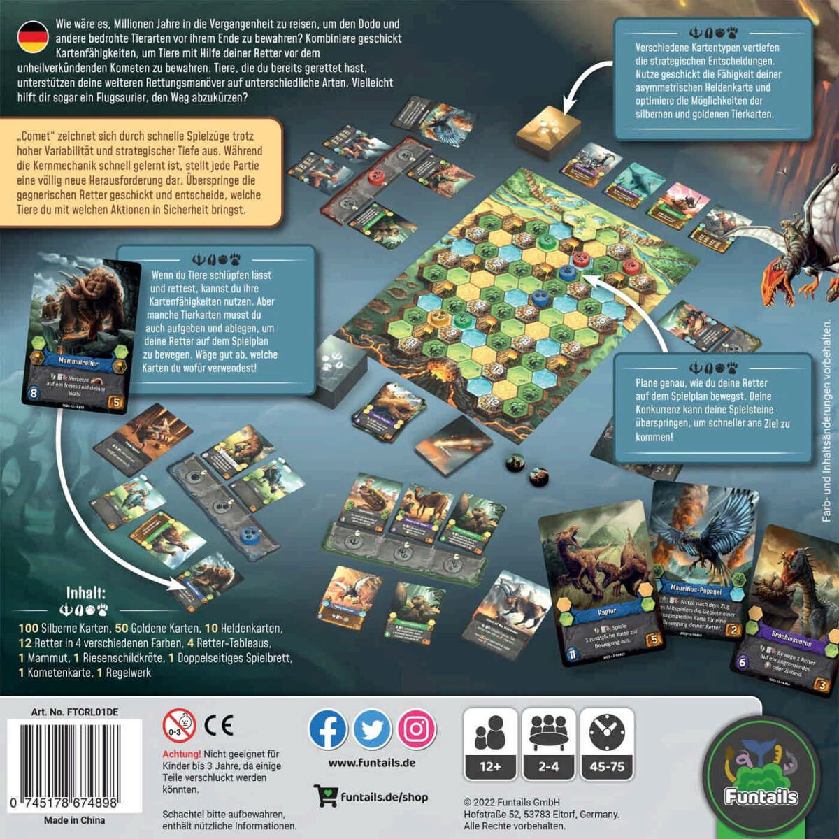 'Comet' bietet 2-4 Spielern ab 12 Jahren schnelle Spielzüge, hohe Variabilität und strategische Tiefe. Rettet in diesem Engine-Builder ohne Kampf verschiedene Tierarten, die euch auf eurer weiteren Rettungsmission auf unterschiedliche Arten unterstützen.