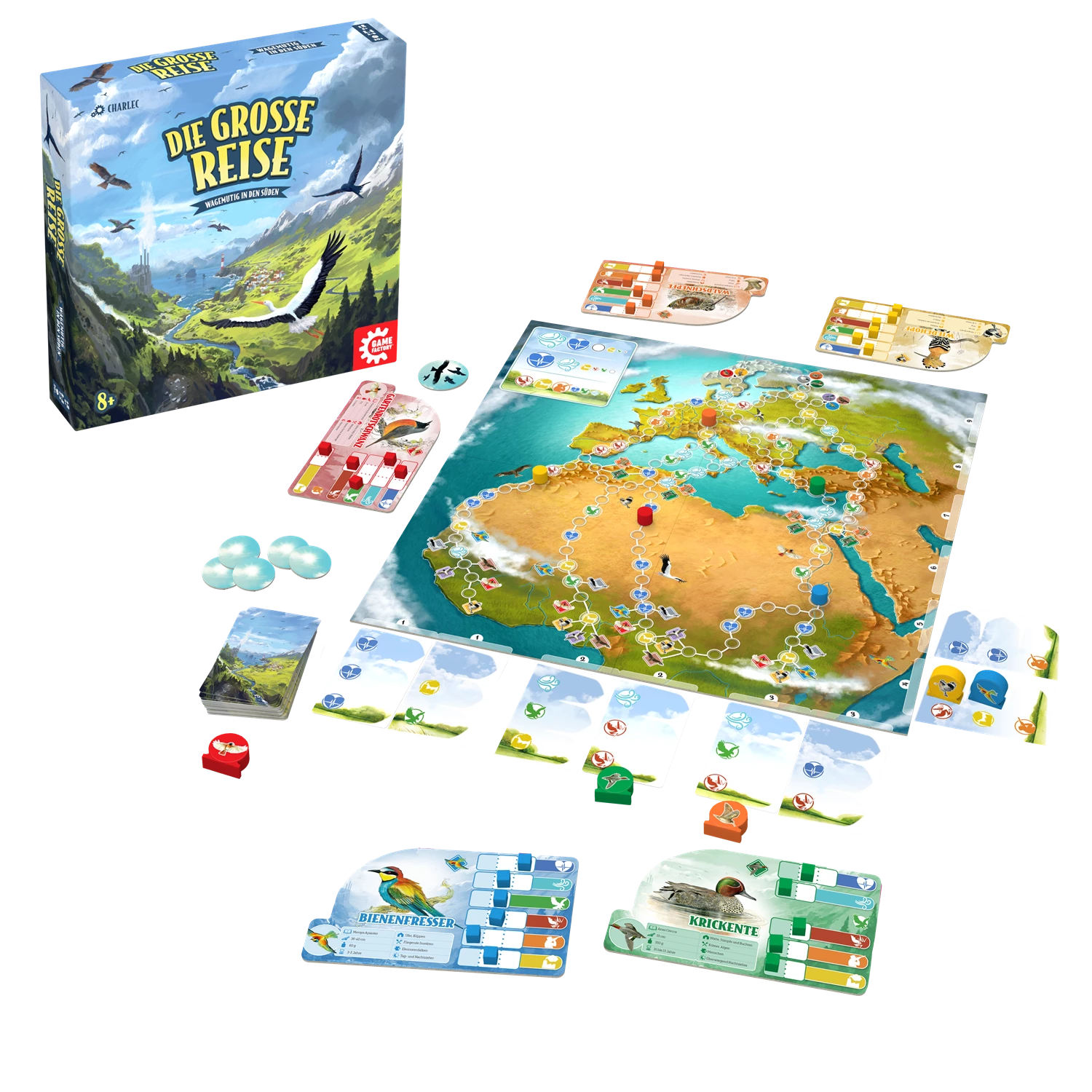 Hast du dich jemals gefragt, wie es so ist, als Zugvogel über tausende Kilometer zu deinem Winterquartier zu reisen? Wag dich auf Die große Reise und finde es heraus! Trotze den unzähligen Gefahren, die dich auf dem Weg erwarten und wähle die beste Flugstrategie, um als Erster im lauschigen Süden anzukommen. Pass dich dabei deiner Vogelart an und riskiere genug, um richtig schnell voranzukommen – aber besser nicht so viel, dass du auf der Strecke bleibst …