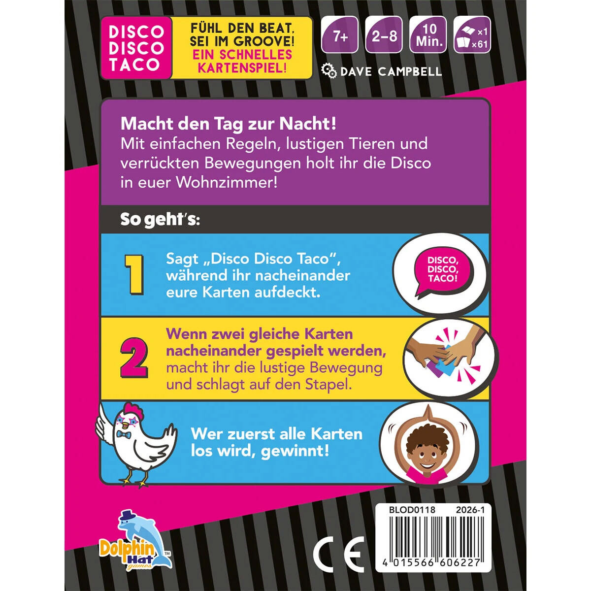 Kurzüberblick: DISCO DISCO TACO ist ein rasantes Reaktionsspiel für 2–8 Personen ab 7 Jahren mit einer Spieldauer von etwa 10 Minuten, in dem ihr im Takt Bewegungen ausführt und beim richtigen Moment schneller zuschlagt als alle anderen.