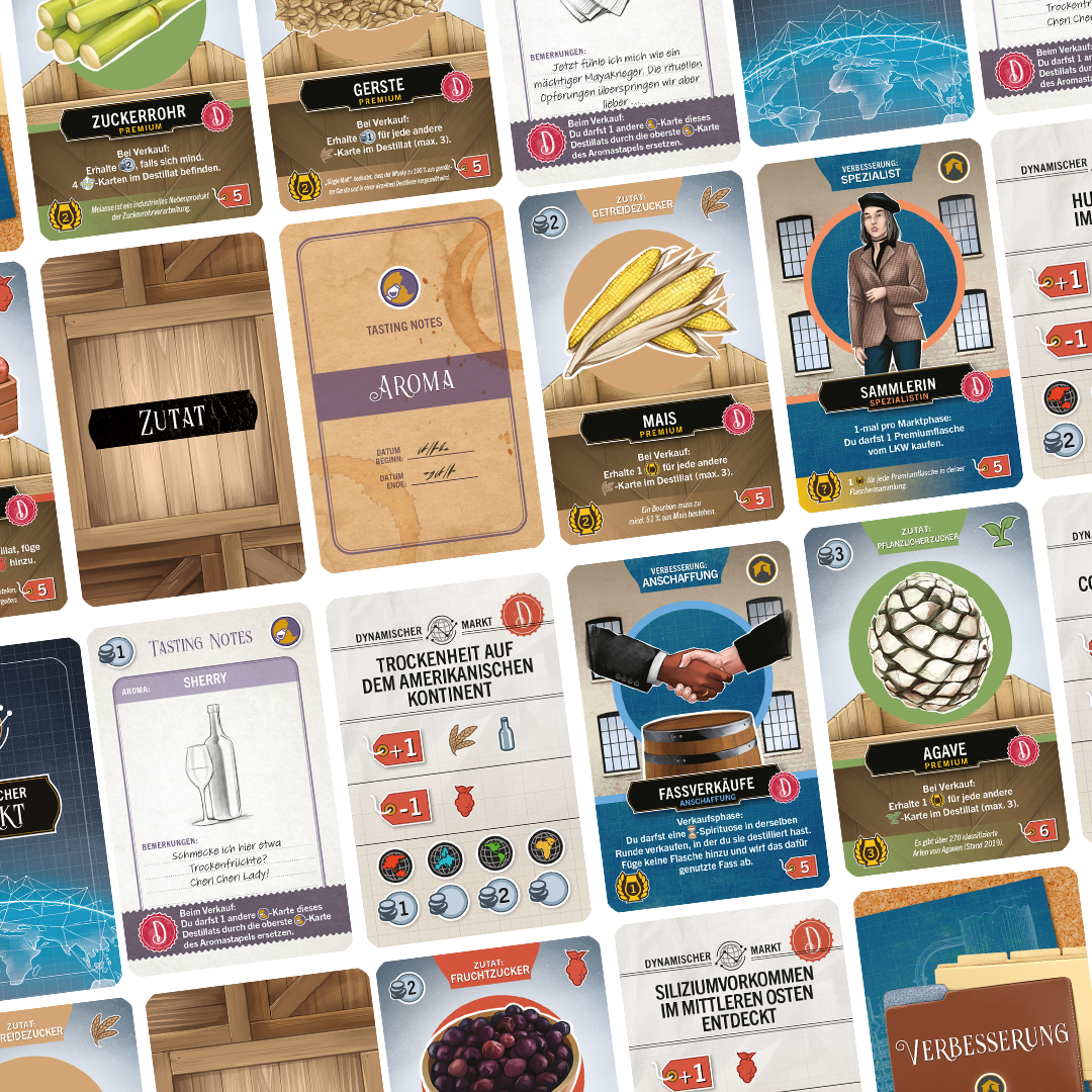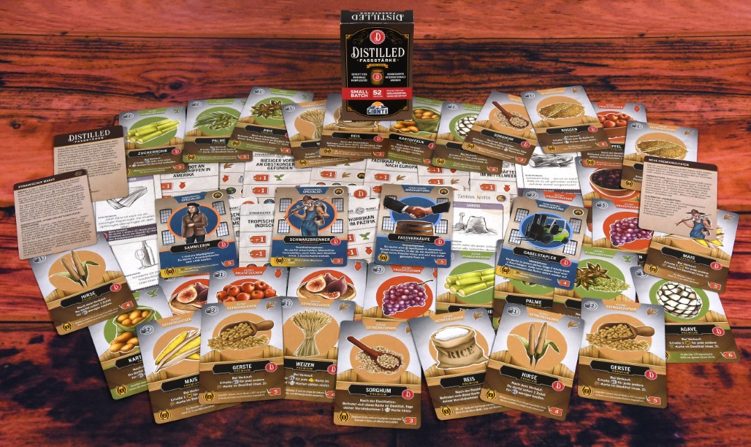 FASSSTÄRKE ist eine Mini-Erweiterung für Distilled und hat ein paar cl mehr Komplexität und Variabilität im Glas. Diese Erweiterung besteht aus 4 Elementen: neue Verbesserungen, spezielle Aromakarten, neue und verbesserte Premiumzutaten und einen spannenden Mechanismus, der einen dynamischen Markt simuliert.