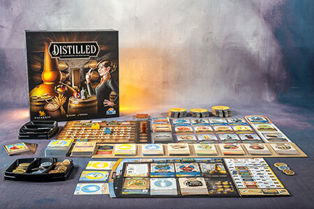 Distilled ist eine Liebesbekundung an die Kunst des Destillierens. Deshalb wurde auf jedes noch so kleine Detail geachtet um ein eigenes Meisterwerk zu kreieren. Im Spiel enthalten sind 18 einzigartige Charaktere mit Spezialrezepten und -fähigkeiten, 19 unterschiedliche Alkoholsorten und etliche Auszeichnungen, die extra Siegpunkte geben. Das Spielmaterial ist aus hochwertigem Material und ein besonderes Highlight sind die hochwertigen Inlays, mit denen es immer wieder Spaß macht das Spiel zu öffnen.
