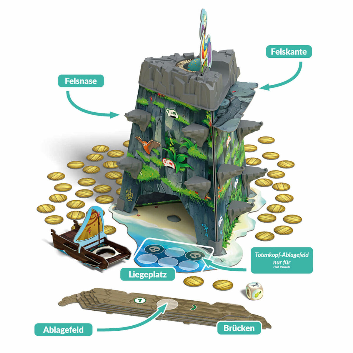 Es war vielleicht nicht der beste Platz dafür, denn nur ein Moment der Unaufmerksamkeit und schon rollt das Ei den Berg hinab zur Felskante. Nun ist eure Geschicklichkeit und Schnelligkeit gefragt um das kullernde Wackel-Ei sicher an den Fuß des Berges zu bringen. Dazu erwürfelt ihr schnell das Baumaterial, sammelt Hammer und Nägel und steckt Brücken im Eiltempo an den Berg.