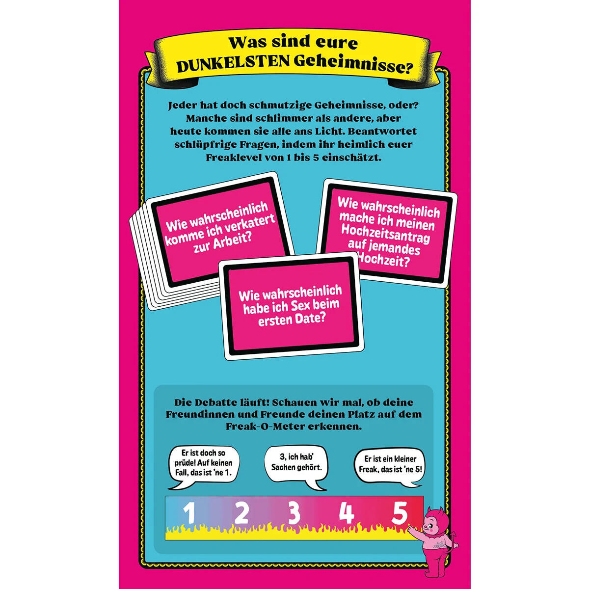 Reihum beantwortet eine Person eine brisante Frage, indem sie sich heimlich auf einer Skala von 1 bis 5 einordnet. Persönlich, intim oder leicht schlüpfrig – alles ist erlaubt, solange es ehrlich ist. Währenddessen versuchen alle anderen gemeinsam einzuschätzen, wo diese Antwort wohl auf dem Freak-O-Meter landet.