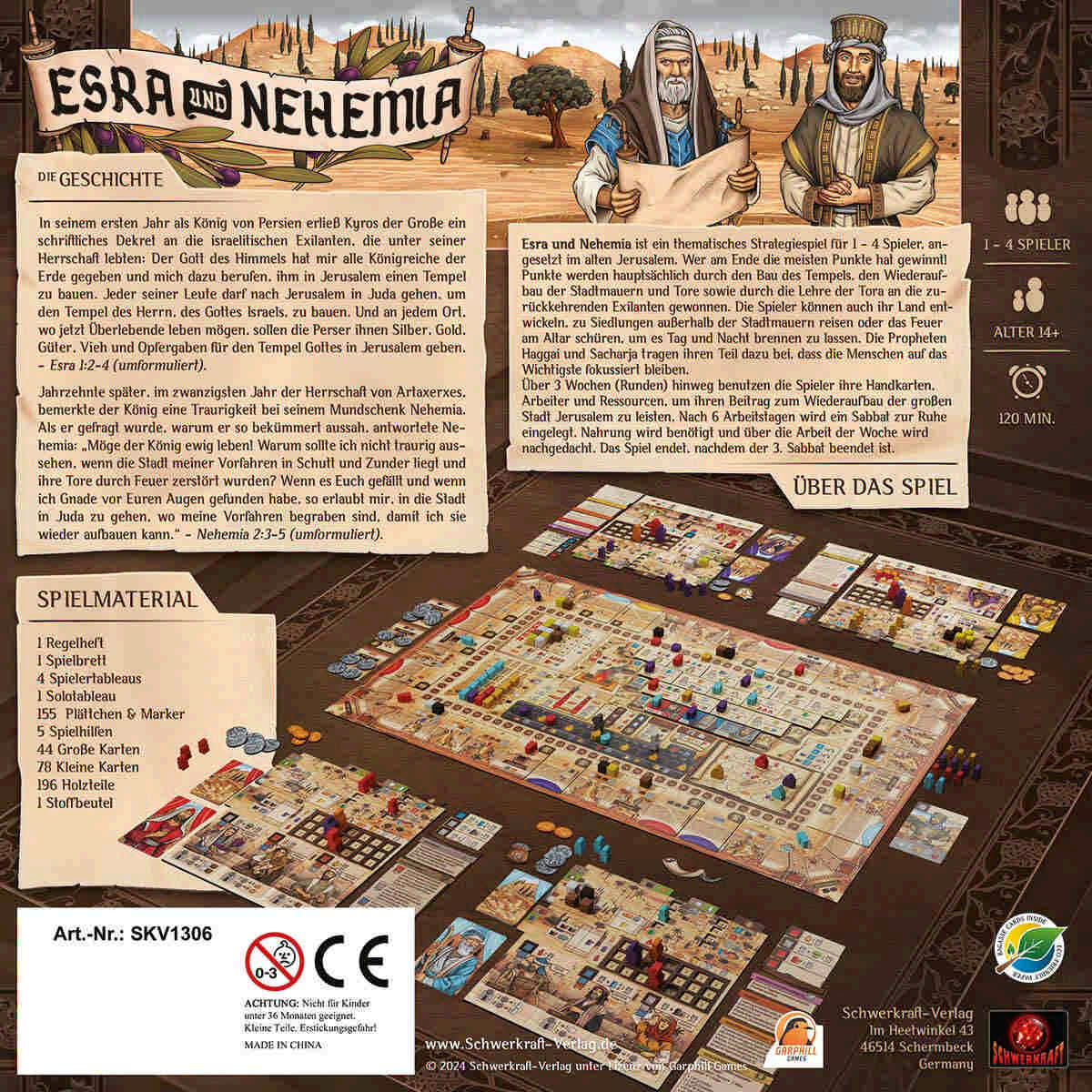 Mit seinem einzigartigen thematischen Zugang, hochwertigen Komponenten und einem durchdachten Aktions- und Kartensystem bietet ESRA UND NEHEMIA eine tiefgreifende Spielerfahrung für Kennerspieler und historisch Interessierte gleichermaßen. Solo oder im Wettbewerb – jede Partie erzählt eine neue Geschichte von Wiederaufbau, Glauben und Gemeinschaft.