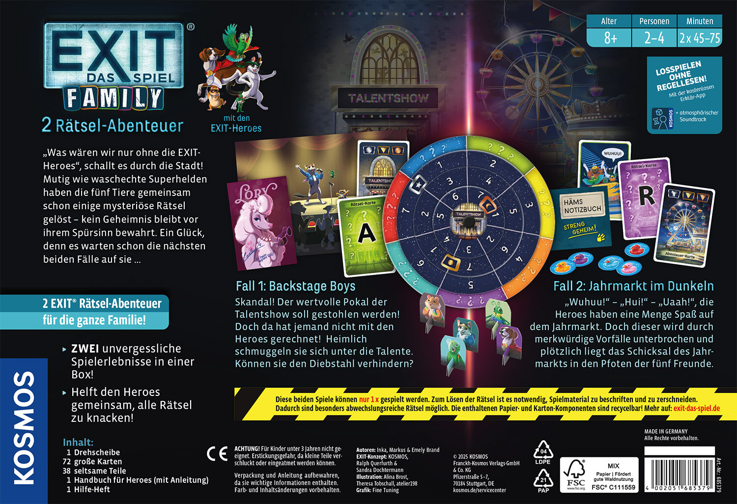Zwei Rätselabenteuer erleben mit den EXIT Heros! Familien und Kinder ab acht Jahren lösen Rätsel bei einer tierischen Talentshow und auf dem nächtlichen Jahrmarkt. Ein leichter Einstieg in die Escape Game-Welt von EXIT® – Das Spiel.