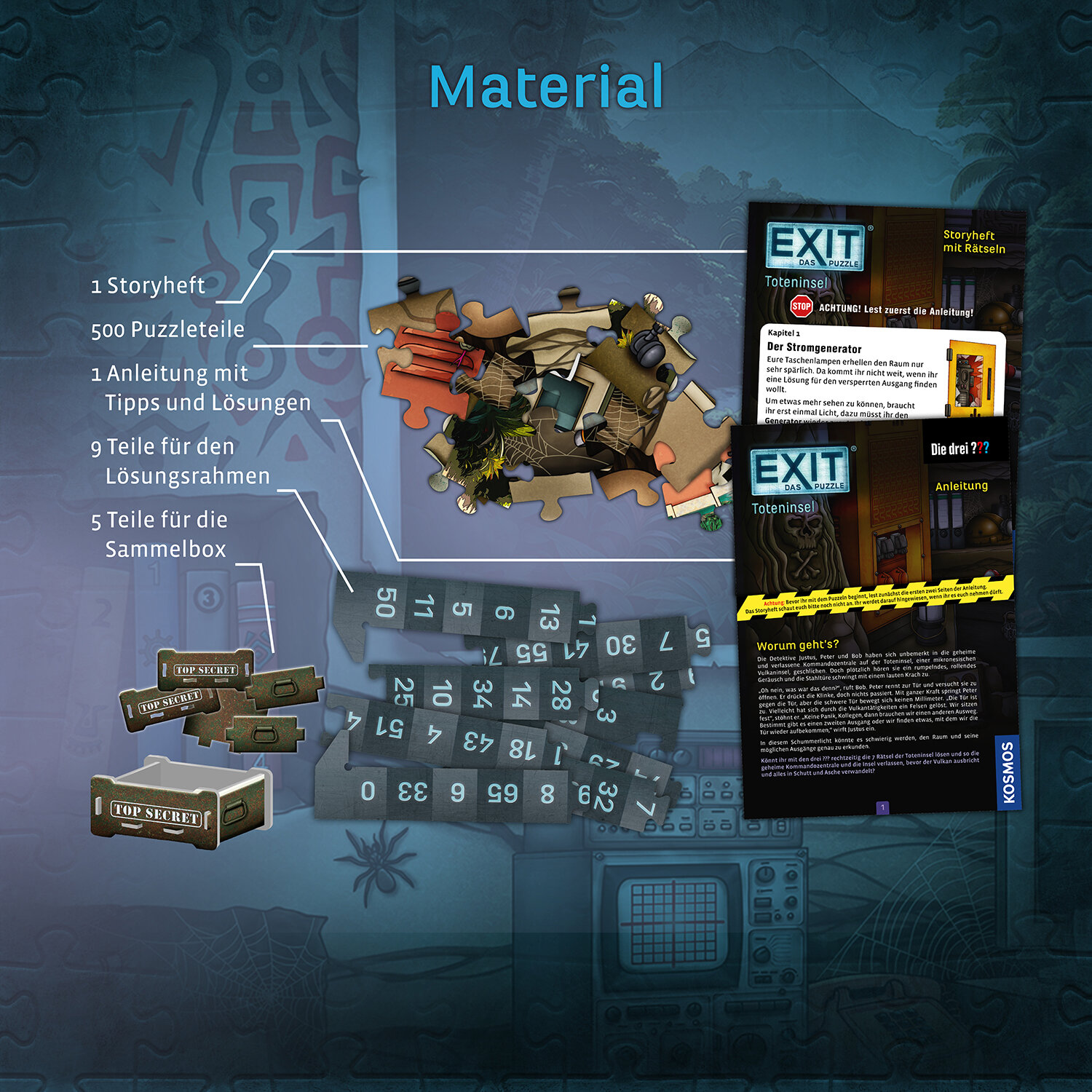 In EXIT® – DAS PUZZLE: DIE DREI ??? TOTENINSEL strandest du gemeinsam mit Justus, Peter und Bob auf einer geheimnisvollen Insel im Pazifik. Nach einem Vulkanausbruch sind die drei Detektive in einer verborgenen Kommandozentrale eingeschlossen. Der einzige Weg in die Freiheit führt über ein detailreiches Puzzle – und über Rätsel, die clever im Motiv versteckt sind.