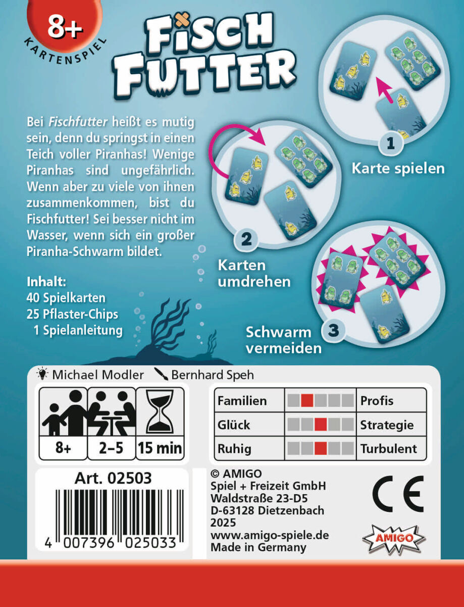 „Fischfutter“ ist ein kurzweiliges Kartenspiel, bei dem du entscheiden musst, ob du risikofreudig blind Piranha-Karten aufdeckst oder dich lieber an die Lage der Kärtchen erinnerst, um dein Glück etwas zu steuern. Besonders spannend wird es, wenn ihr die kooperative Variante ausprobiert und euch gemeinsam gegen den bedrohlichen Schwarm behaupten müsst. Dabei gilt es, geschickt zu planen, die richtigen Momente abzupassen und vor allem einen kühlen Kopf zu bewahren.