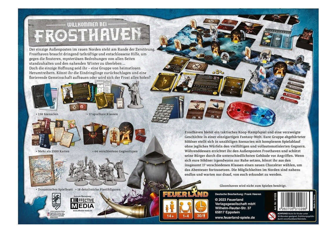 Frosthaven bietet euch ein taktisches Koop-Kampfspiel mit einer verzweigten Geschichte. Als Gruppe von abgehärteten Söldnern stellt ihr euch vollautomatisierten Gegnern in zahlreichen Szenarien mit komplexem Spielablauf, ohne jegliches Würfeln. gleichzeitig errichtet ihr den Außenposten Frosthaven und beschützt ihn vor den Angriffen. Wenn sich die Karriere eurer Söldner dem Ende neigt und sie sich zur Ruhe setzen, könnt ihr aus insgesamt 17 Klassen einen neuen Charakter wählen und das Abenteuer fortsetzen. Erkundet die nahezu unendlichen Möglichkeiten, die euch der Norden bietet.