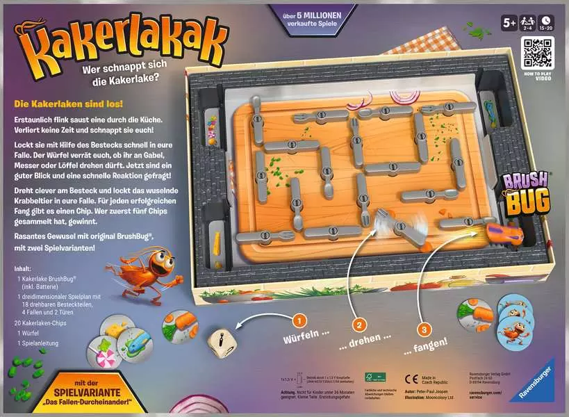 Wer kann sich das herumwuselnde Insekt mit Hilfe des ausliegenden Bestecks schnappen? Der Würfel entscheidet, ob Gabel, Messer oder Löffel gedreht werden. Wird das Besteck geschickt gedreht, kann die Kakerlake in einer Falle gefangen werden. Wem die Kakerlaken-Falle gehört, bekommt einen Chip. Die Jagd auf das lichtscheue Krabbeltier gewinnt, wer zuerst fünf Chips ergattern konnte! Das Ausgangslabyrinth kann bei jeder neuen Spielrunde variiert werden – letztendlich beweist die Kakerlake aber immer wieder, dass sie einen eigenen Kopf hat und ganz anders abbiegt, als erwartet! Kakerlakak ist eine rasante und lustige Jagd für clevere Fallensteller mit original HEXBUG® nano™. Ausgezeichnet mit mehreren Preisen, unter anderem mit dem Deutschen Spielepreis als Bestes Kinderspiel 2013.