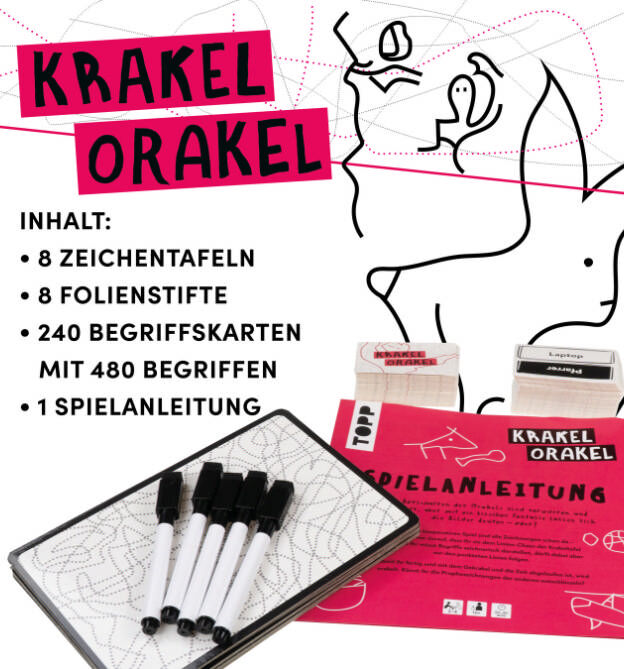 Beim Krakel-Orakel schlüpfst du in die Rolle einer kreativen Entdeckerin oder eines kreativen Entdeckers. Alle Spieler zeichnen gleichzeitig Begriffe auf ihren Tafeln, ohne dabei die vorgegebenen Linien zu verlassen. Anschließend müsst ihr euch reihum daranmachen, zu entschlüsseln, was die anderen verzapft haben. Nur wenn ihr euch geschickt abstimmt und eure Vermutungen trittsicher trefft, habt ihr eine Chance, aus diesem Strich-Gewirr schlau zu werden.