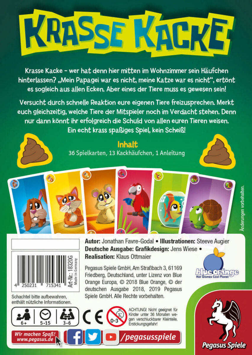 Na toll. Mitten in der Küche liegt ein Häufchen. Und plötzlich schaut jeder dich an. In KRASSE KACKE beginnt ein turbulentes Fingerzeigen: War es dein Hamster? Die Schildkröte? Oder doch der Papagei vom Nachbarn? Jetzt heißt es schnell schalten, geschickt beschuldigen und bloß nicht ins Stocken geraten.