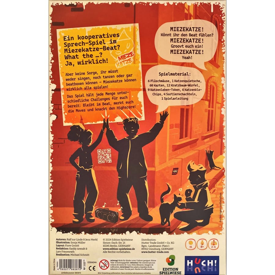 Miezekatze ist ein kooperatives Sprech- und Rhythmusspiel für 2–6 Personen ab 8 Jahren. Ohne singen, tanzen oder beatboxen zu müssen, meistern die Spieler verschiedene Challenges im Miezekatze-Beat.