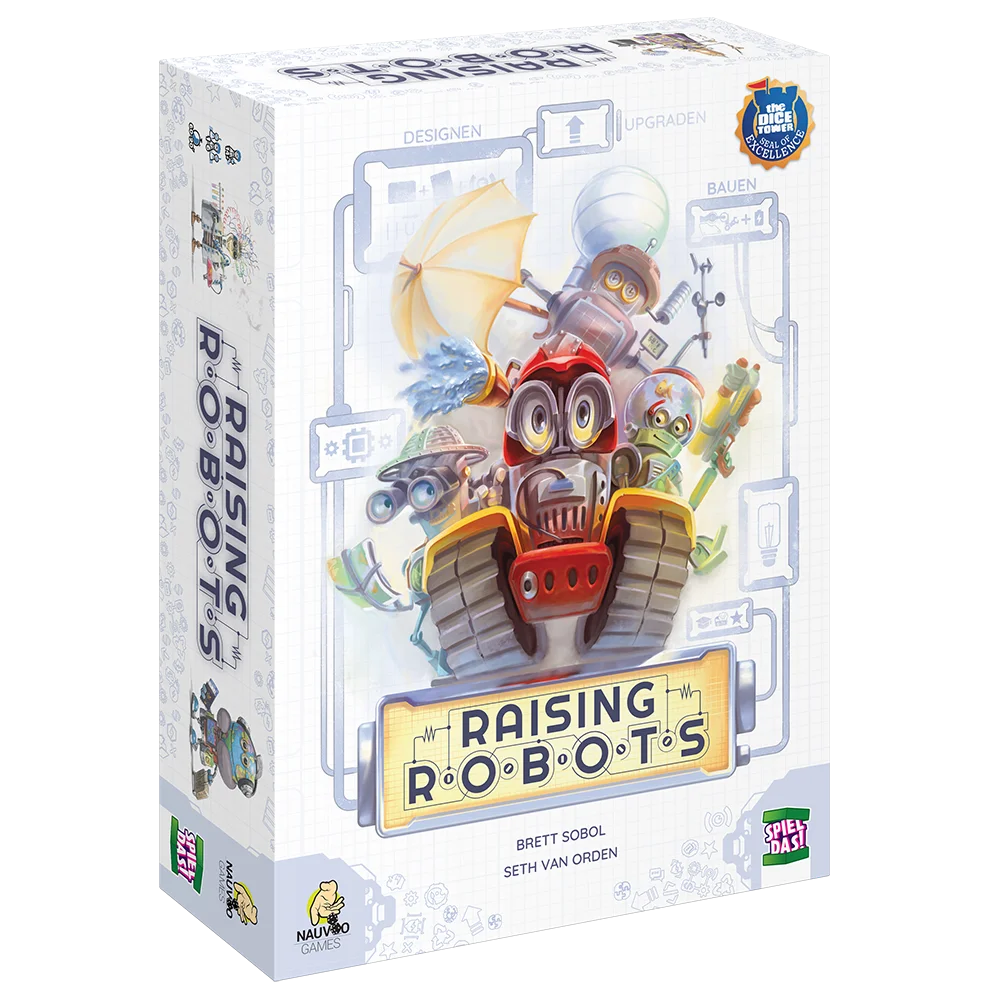 "Raising Robots" ist ein kompetitives Engine-Building-Spiel. Ihr wählt gleichzeitig zwei oder mehr Aktionen aus und führt sie aus: Aufrüsten, Zusammenbauen, Entwerfen, Herstellen, Recyceln. Jede Aktion wird mit einer variablen Menge an Energie ausgeführt, um sie besser oder schlechter zu machen. Die stärksten Aktionen helfen aber auch deinen Gegnern. Wer nach acht Runden die meisten Punkte hat, gewinnt.