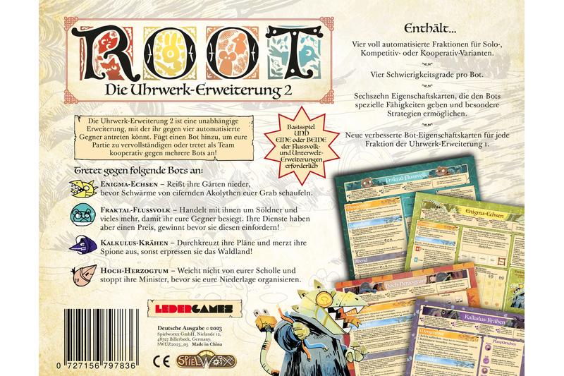 Die Uhrwerk-Erweiterung ist eine eigenständige Erweiterung, mit der ihr gegen vier automatisierte Gegner antreten könnt. Fügt einen Bot hinzu, um eure Partie zu vervollständigen oder tretet als Team kooperativ gegen mehrere Bots an!