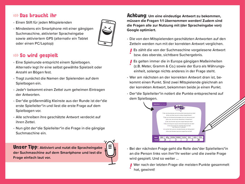 • Spieleblock mit 128 Seiten und über 400 Schätzfragen für superlangen Spielespaß
