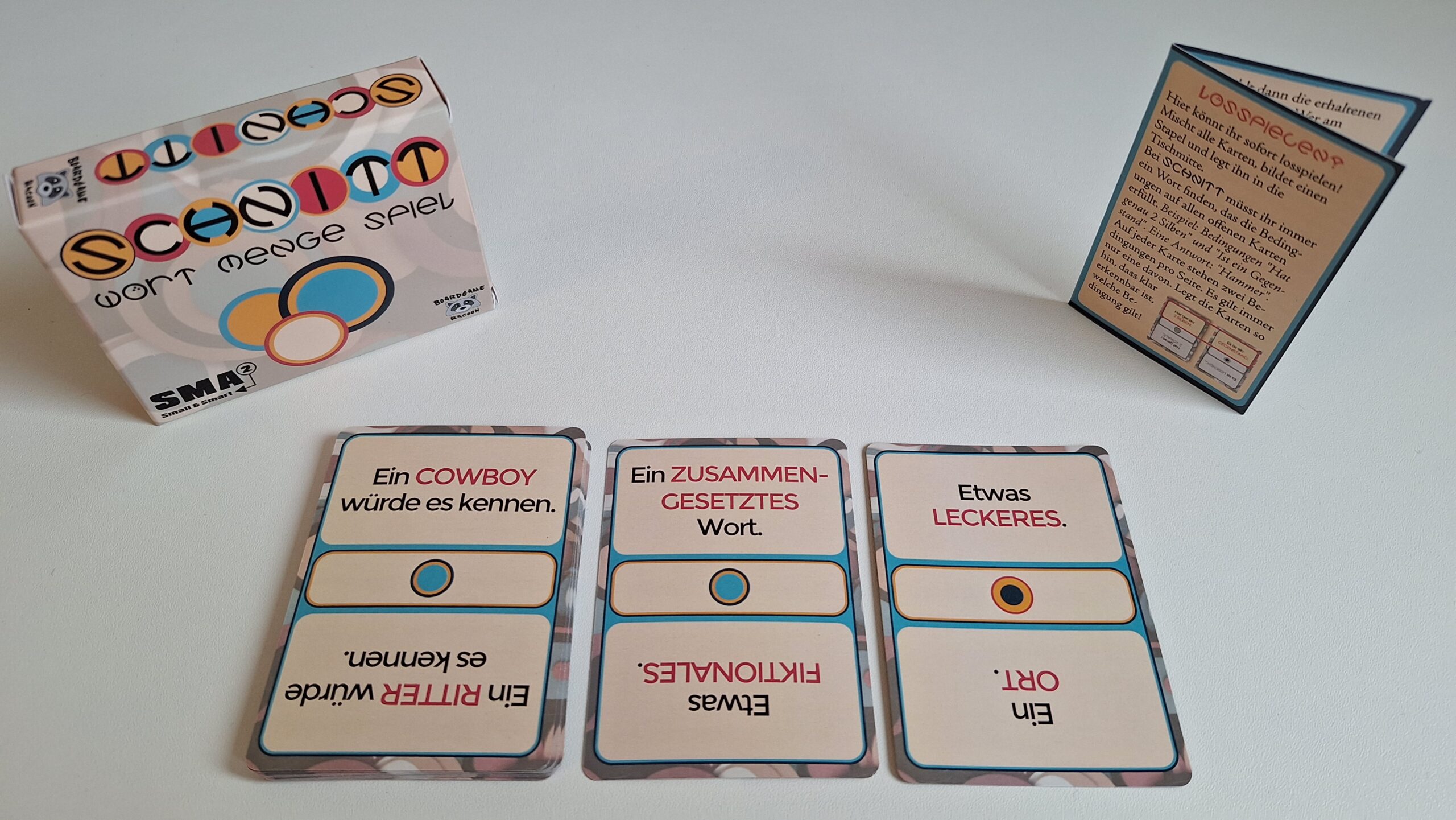 Schnitt ist ein Kartenspiel mit minimalen Regeln für 1 bis 8 Personen. Auf den Karten findet ihr die unterschiedlichsten Forderungen, welche das jeweils gesuchte Wort erfüllen muss. Vom bestimmten Buchstaben, über Silbenanzahl bis zu inhaltlichen Bedingungen. Ihr deckt die Karten auf und versucht irgendein Wort zu finden, auf das alle Bedingungen zutreffen. Zu einfach? Dann nehmt noch weitere Bedingungen hinzu oder versucht an den verschiedenen Rätselmodi wie Kategorienkette oder Rasterrätsel.