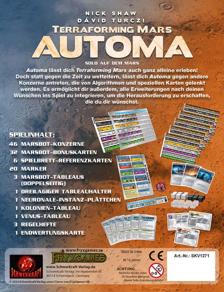 Mit 46 unterschiedlichen Marsbot-Konzernen, variablen Schwierigkeitsgraden und anpassbaren Modulen ist AUTOMA ein herausforderndes Solospiel, das sich jederzeit nach deinen Vorlieben gestalten lässt. Ob mit Grundspiel oder unter Einbezug der Erweiterungen wie Venus, Kolonien oder Aufruhr – du bestimmst das Setup, die Gegenspieler und den Schwierigkeitsgrad. Und durch die cleveren Mechaniken fühlt sich jeder Marsbot wie ein echter Gegner an.