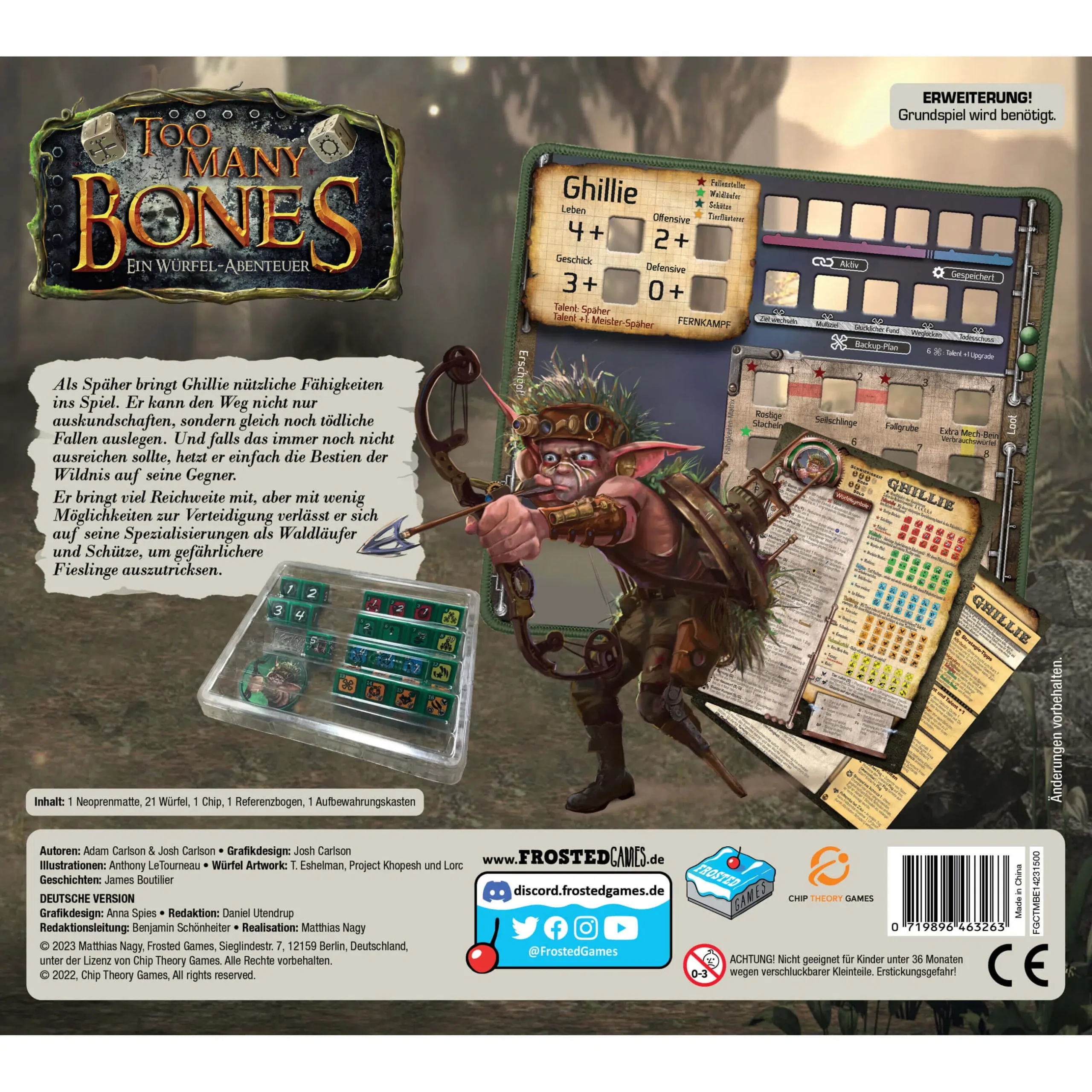 Ghillie ist eine Gearloc-Erweiterung für Too Many Bones. Sie bringt einen neuen Charakter mit dazugehöriger Charakter-Matte und 21 Würfeln – und damit viel taktische Tiefe.