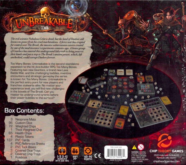 Too Many Bones: Unbreakable is the second standalone expansion to the hit dice-builder RPG Too Many Bones. Featuring two new Gearlocs, a brand new Lava Battle Mat, and and the challenging baddies, inventive encounters and strategic gameplay the series is known for, Too Many Bones: Unbreakable is the perfect entry point for new players and franchise stalwarts alike. No matter your experience level, you will find new challenges in the bowels of The Break. Can you master its underground tyrants before their power bubbles to the surface?