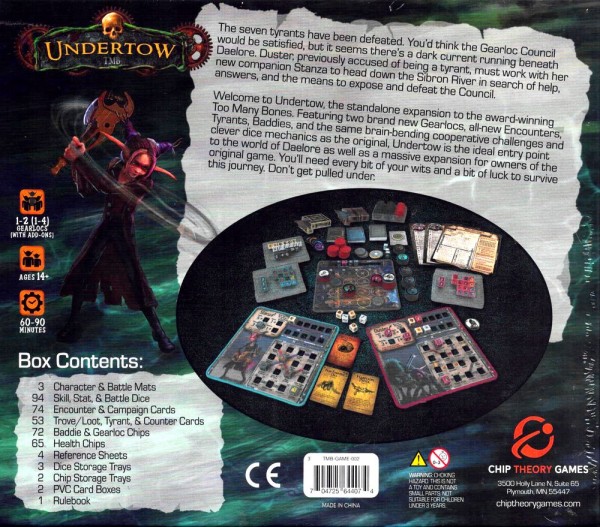 Undertow is playable for 1-2 players out of the box or 3-4 players by adding additional Gearloc characters via Add-ons or from the original Too Many Bones. Encounters, Baddies, Tyrants, and Gearlocs from Too Many Bones and 40 Days in Daelore are fully compatible with Undertow.