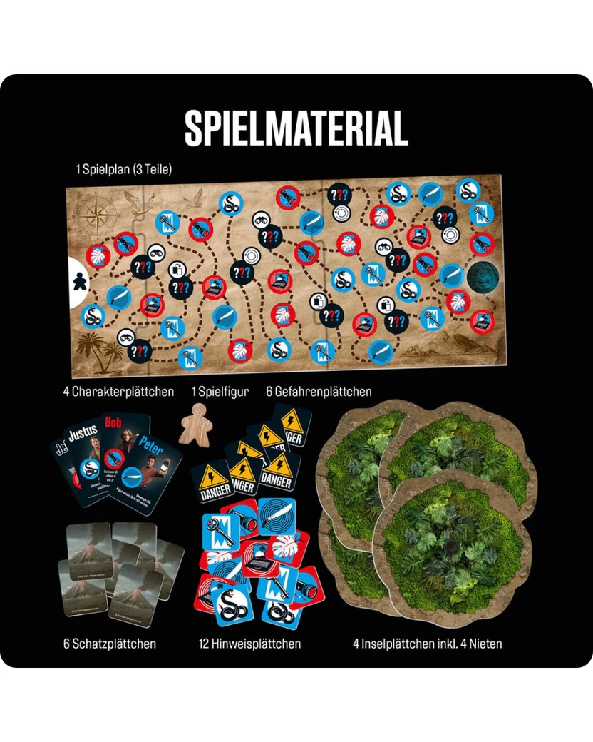 Mit Justus, Peter und Bob das Kinoabenteuer „Die drei ??? Toteninsel“ noch einmal hautnah miterleben. Spielplan ausbreiten, Plättchen bereitlegen und losspielen. Mit den Detektiven aus Rocky Beach eine spannende Schatzsuche starten, sich die Hinweis-Symbole merken und gemeinsam kombinieren. Wird der Eingang zur Schatzkammer gefunden? Spannender Merk- und Spielspaß für zwei bis vier Spielerinnen und Spieler ab acht Jahren. Ein tolles Geschenk für Fans – mit exklusivem Bildmaterial aus dem Film.