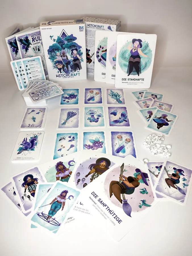 In "WITCHCRAFT" schlüpfst Du in die Rolle einer mächtigen Hexe, jede mit einzigartigen Anfangsfähigkeiten ausgestattet. Während des Spiels tauschst Du Kristalle gegen Zutaten, die Du benötigst, um mächtige Zauber zu wirken. Durch den cleveren Erwerb neuer Zaubersprüche und das Gewinnen von vertrauten Gefährten, die Dir auf Deinem magischen Weg zur Seite stehen, erweiterst Du Deine magischen Fähigkeiten. Jeder erfolgreich gewirkte Zauber bringt Dir Magiepunkte ein. Ziel des Spiels ist es, als Erste(r) 20 Magiepunkte zu sammeln und so das Spiel zu gewinnen.