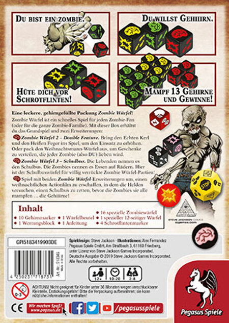 Zombie Würfel ist der No-Brainer unter den Würfelspielen. Deckel auf und schon kann es losgehen. Als hungrige Untote wollen die Spielenden schmackhafte Gehirne sammeln. Wenn das Futter nur nicht immer versuchen würde, wegzulaufen – oder noch schlimmer: sich zur Wehr zu setzen. Filmreif wird die Jagd im Double Feature: Ob mit Liebespaar oder Weihnachtsmann in der Opferrolle, diese Zombie-Blockbuster sollte keiner verpassen. Und für alle, die vom wilden Gewürfel nicht genug bekommen können, lässt der Schulbus mit seinem großen zwölfseitigen Würfel ein neues Spielgefühl entstehen.